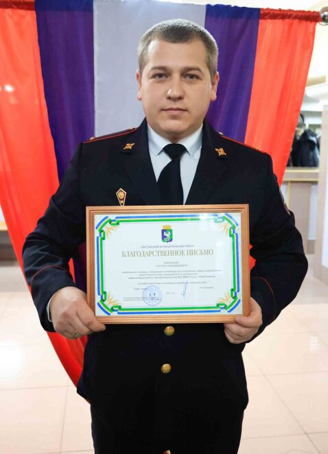 Заместитель начальника Управления по работе с территорией Владимир Львов поздравил присутствующих и вручил награды главы Омутинского округа. Благодарственные письма за высокие показатели в оперативно-служебной деятельности, добросовестное исполнение служебных обязанностей, осуществление на высоком профессиональном уровне охраны общественного порядка получили капитан внутренней службы Денис Кондратьев и лейтенант полиции Сергей Кириленко.