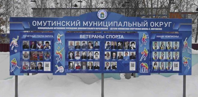 На Доске размещены портреты людей, внесших значимый вклад в развитие омутинского и российского спорта. Она включает три раздела: "Ветераны спорта", "Наши чемпионы" и "Почетные гости округа". Каждый из них имеет QR-код. Перейдя по нему, можно подробнее узнать о спортсменах, чьи цветные фотографии размещены на сине-голубом стенде с ночной подсветкой.