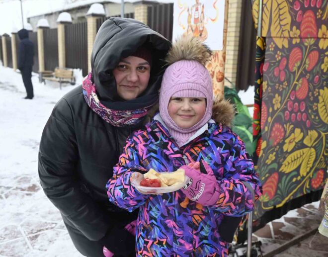 — Метель нас не испугала, приехали посмотреть на гуляние. Масленицу мы отмечаем — это наш российский праздник! На масленичной неделе ели блины. Сейчас концерт посмотрим, чайку попьём и в соревнованиях поучаствуем.
