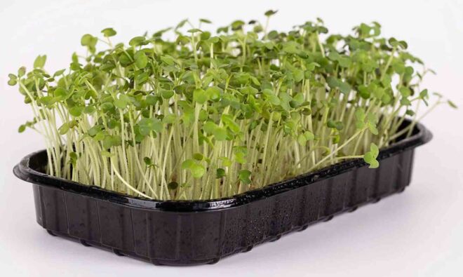 Помимо банки с крышкой-ситом, прорастить микрозелень легко в лотке с субстратом (кокосовый, агровата, джутовые, льняные, войлочные коврики).