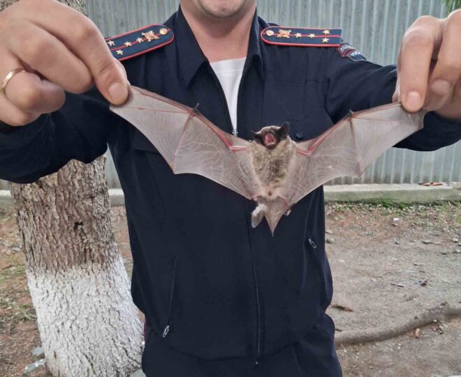 Сотрудники внутренних дел "задержали" необычную нарушительницу, когда она, свесив крылья, приходила в себя на дереве. Как предположили стражи порядка, летучую мышь могли атаковать и потрепать любопытные сороки, но ей удалось спастись. Ночная обитательница была не особо рада встрече с людьми. Она шипела, раскрыв пасть с тонкими, острыми, как иглы, зубами. Сфотографировав момент на память, полицейские отпустили незваную гостью. Всё было по протоколу - без обвинений и с уважением к правам животных.